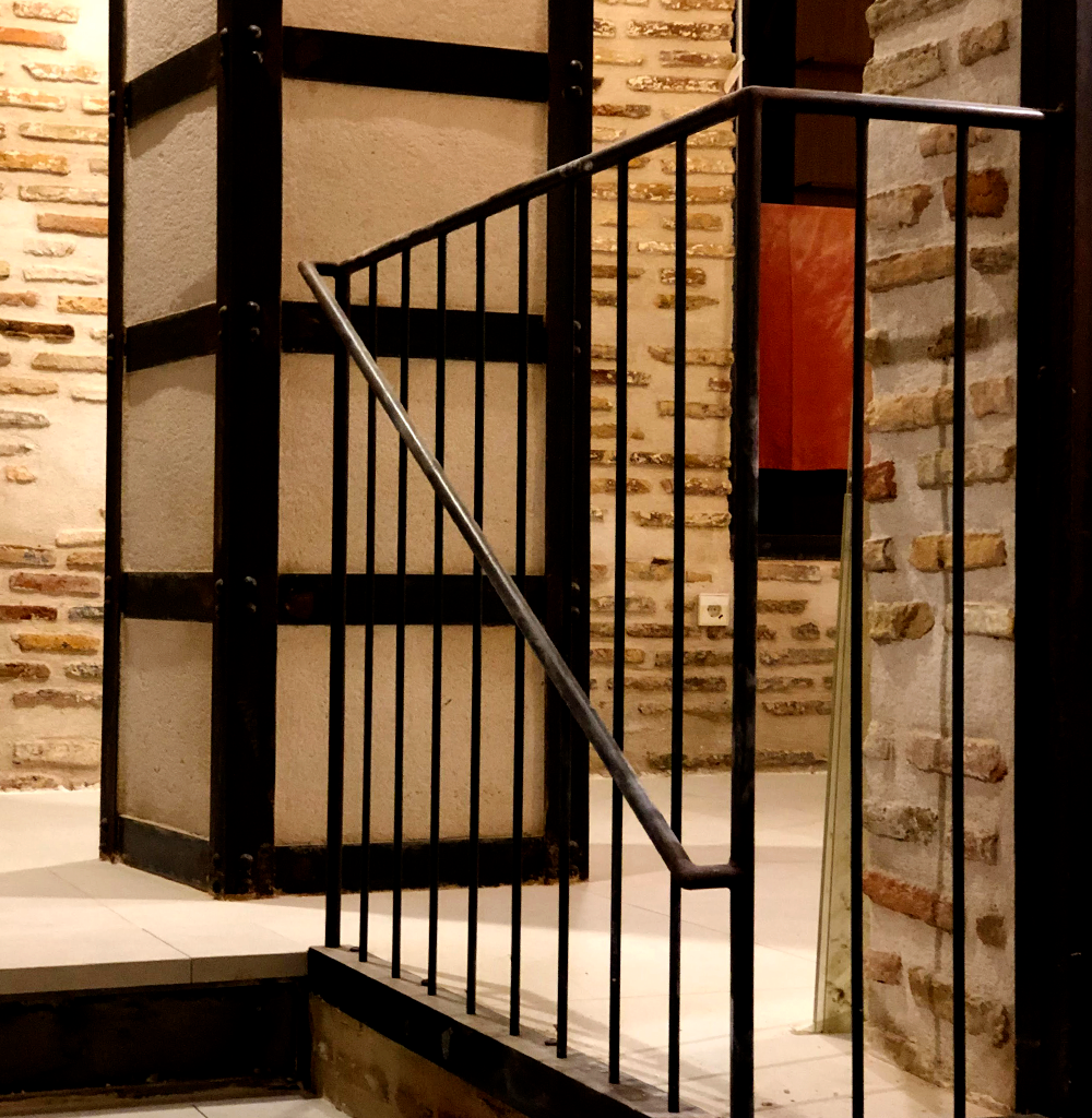 Barandilla de forja artesanal diseñada a medida para interiores rústicos. Fabricada con perfiles de hierro macizo y un acabado en pintura al horno para garantizar máxima durabilidad. Su diseño de líneas limpias y balaustres verticales respeta la esencia de la herrería tradicional toledana.