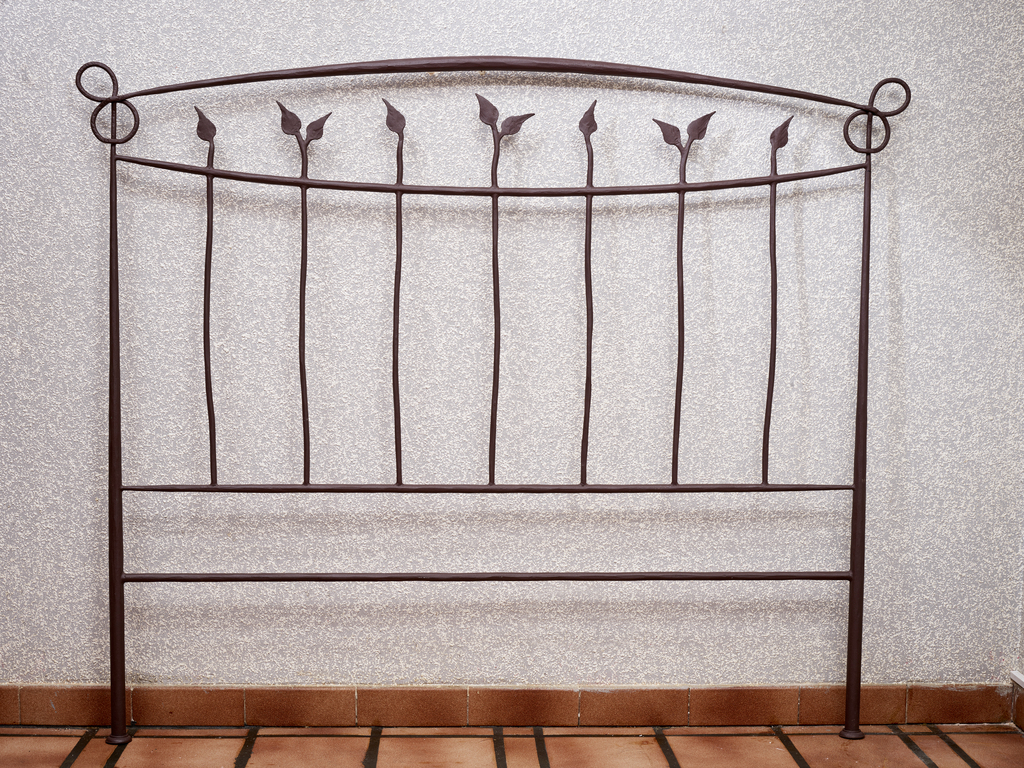 Aporta un toque orgánico y sereno a tu dormitorio con este cabecero de hierro forjado a mano. Su diseño destaca por una estructura de líneas verticales que culminan en delicadas decoraciones en forma de hojas o flores, aportando un aire de naturaleza y ligereza visual.